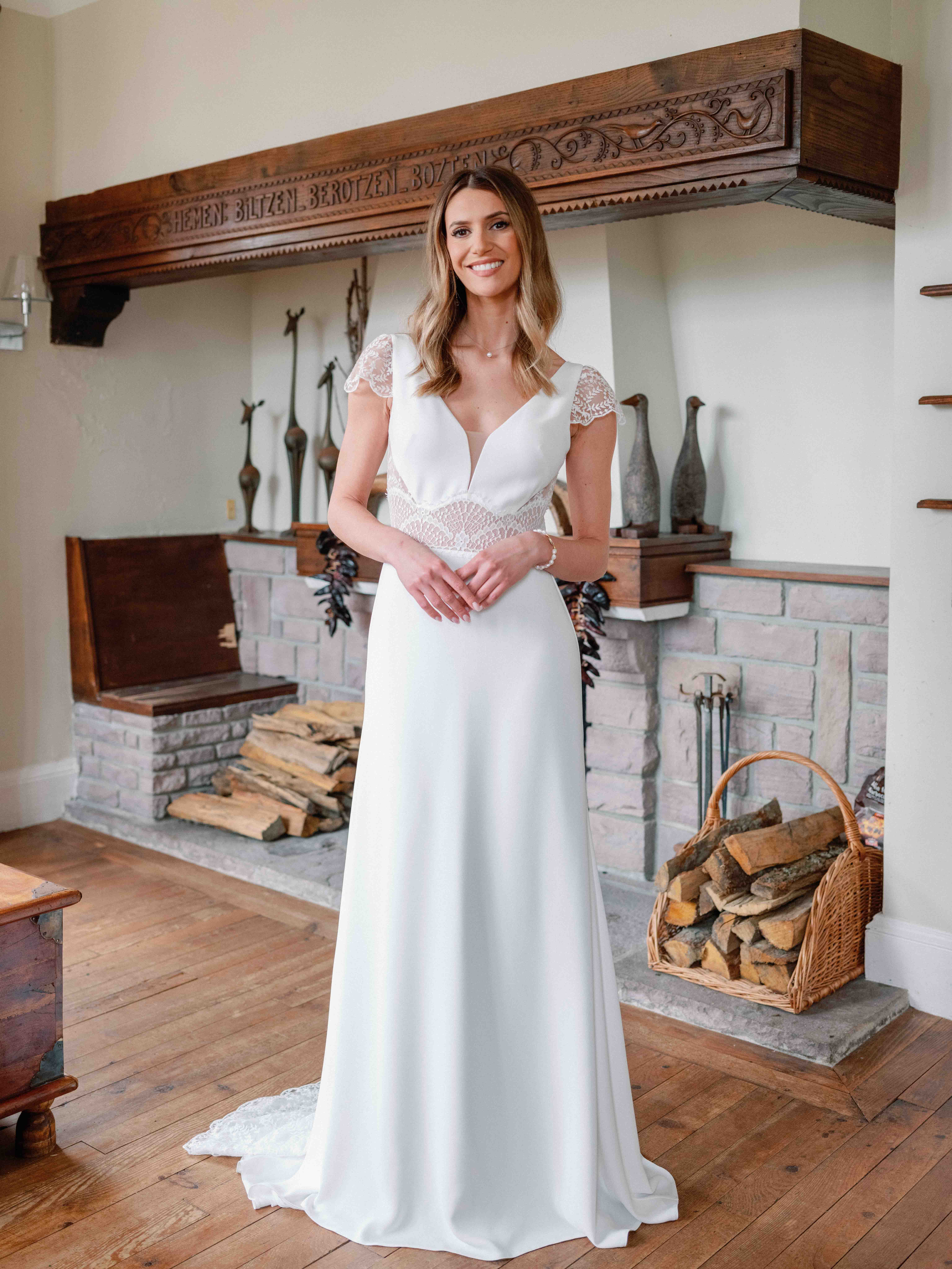 La robe de mariée Alma de la maison Angeola est une création raffinée qui associe la modernité du crêpe fluide à la délicatesse de la dentelle de coton. Ses manchettes élégantes apportent une touche romantique et originale, idéale pour une mariée en quête d’un style unique.