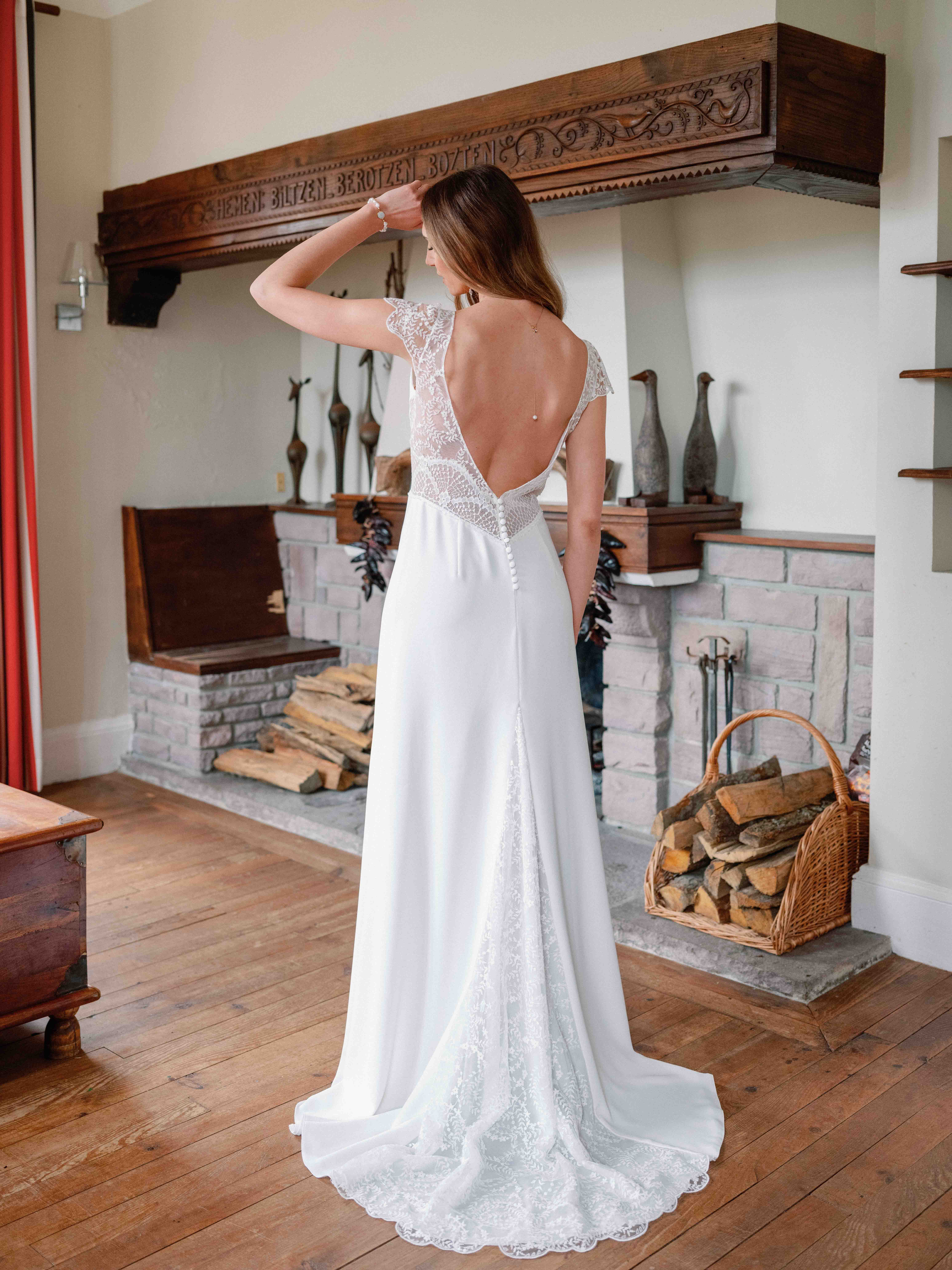 Le dos en V profond sublime la silhouette avec sensualité et élégance, tandis que la coupe en crêpe assure un tombé parfait et une allure élancée. La dentelle de coton, travaillée avec finesse, vient souligner la féminité de la mariée, alliant authenticité et modernité.