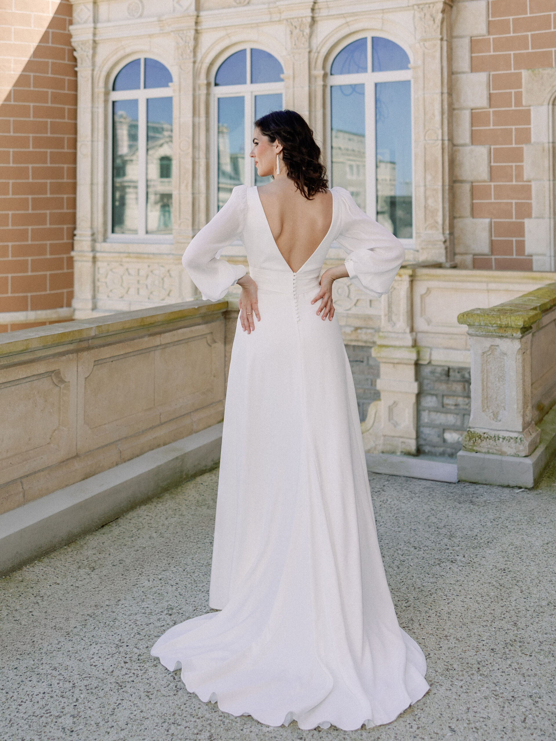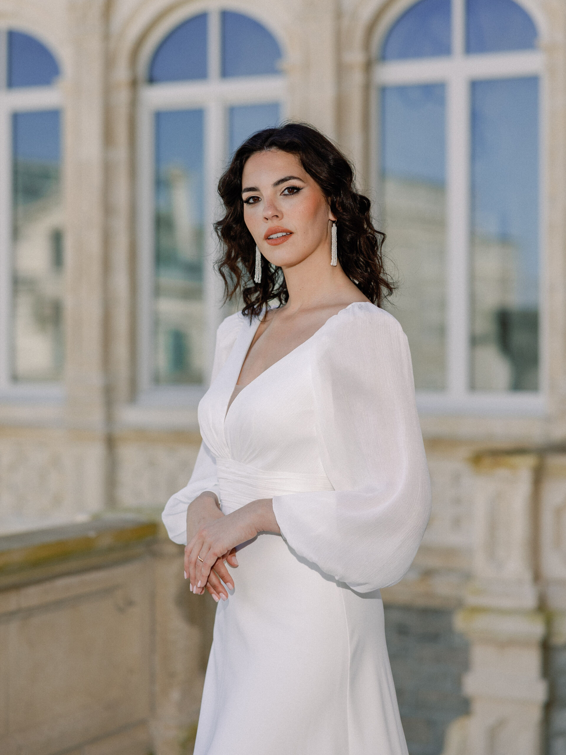 La robe de mariée Anna de la maison Angeola est une création raffinée qui associe la modernité du crêpe fluide à la délicatesse de la mousseline legerement plissée. Ses manches longues élégantes apportent une touche romantique et originale, idéale pour une mariée en quête d’un style unique.