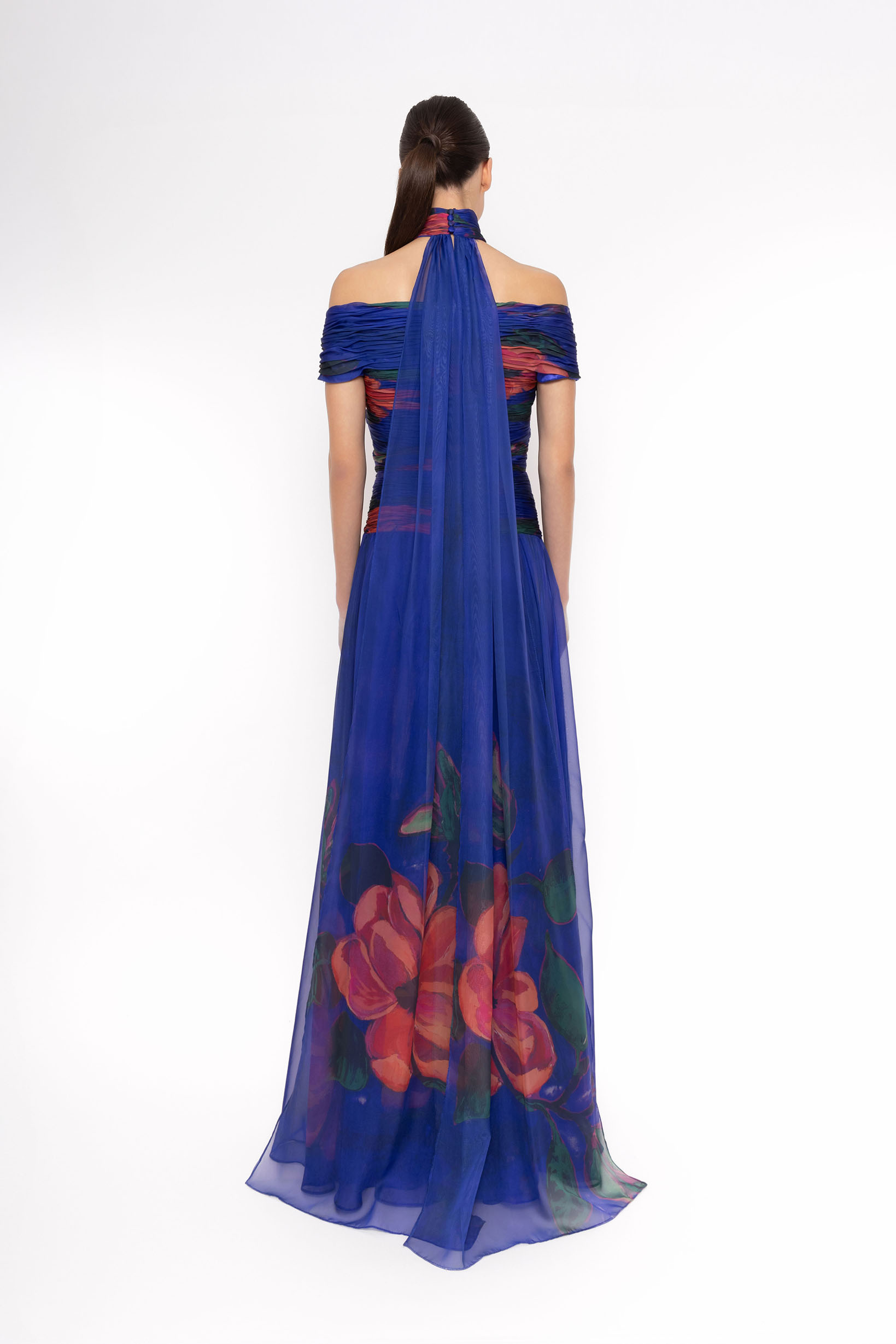 Sublime robe longue Carla Ruiz en mousseline drapée bleue avec imprimé artistique multicolore et encolure bardot. Idéale pour mariage, gala et soirée élégante.