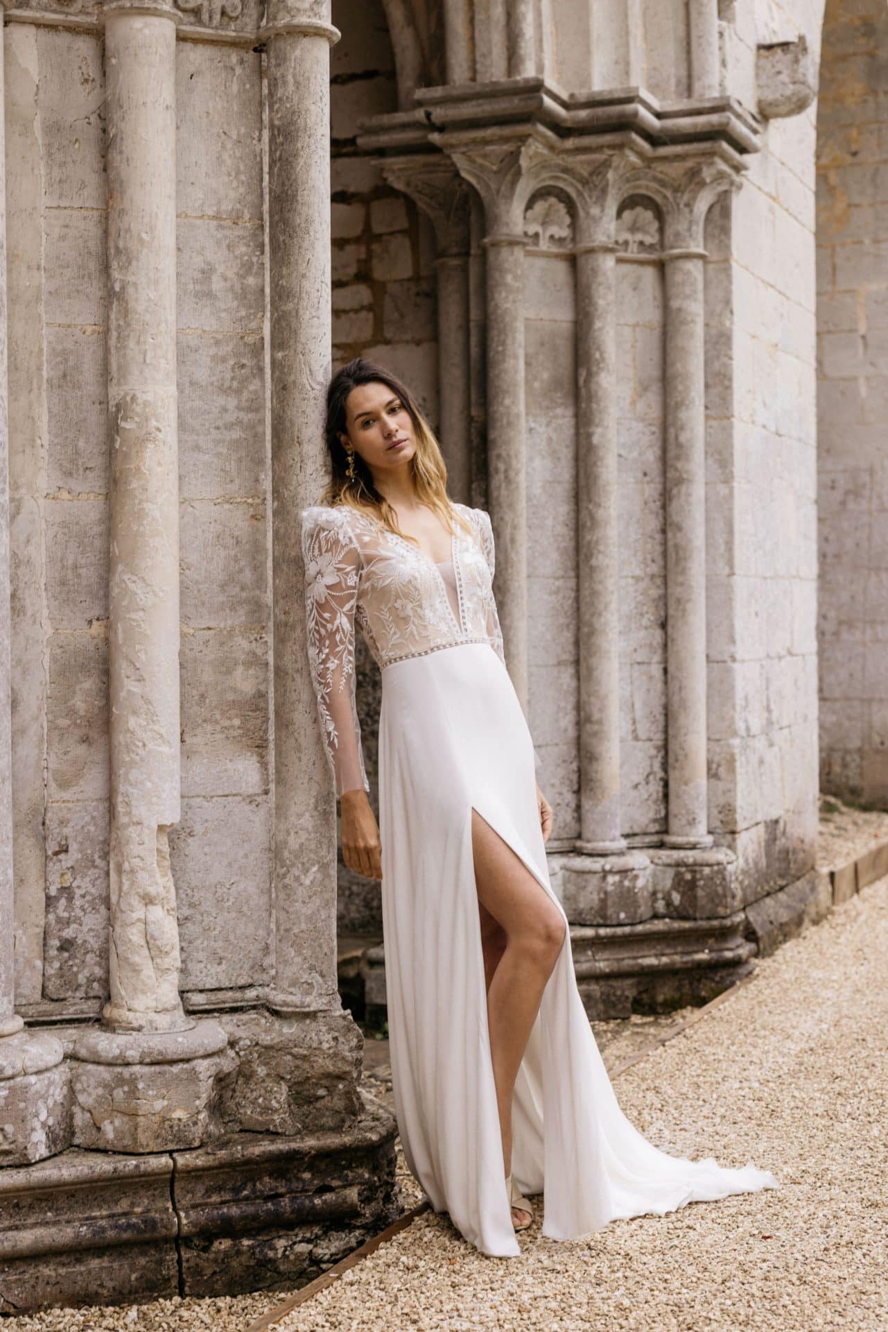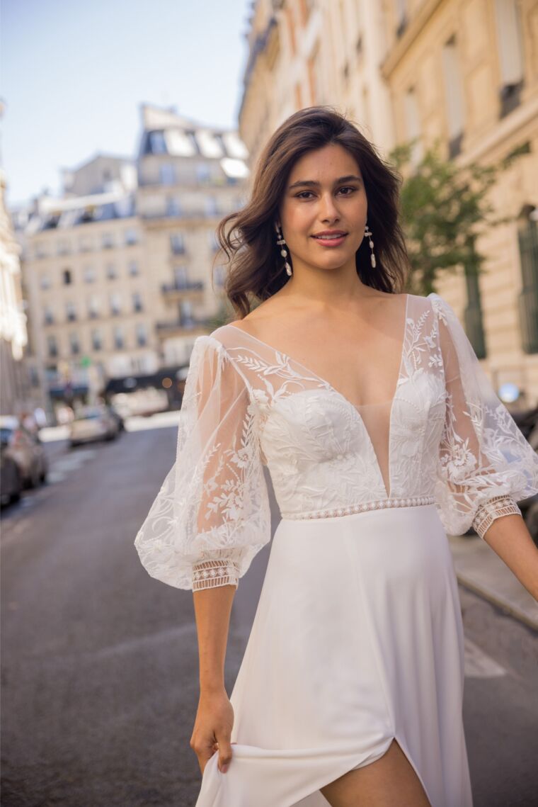 Cette collection met en avant des modèles raffinés en crêpe et en dentelle, parfaits pour les mariées à la recherche d’un style moderne et élégant.