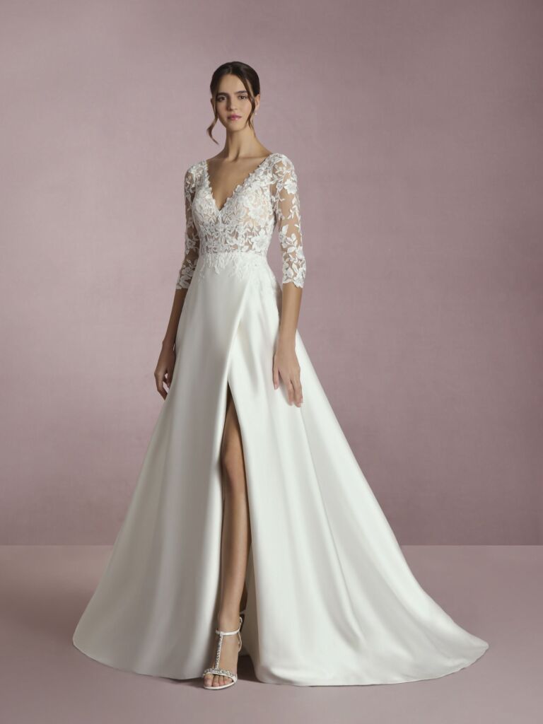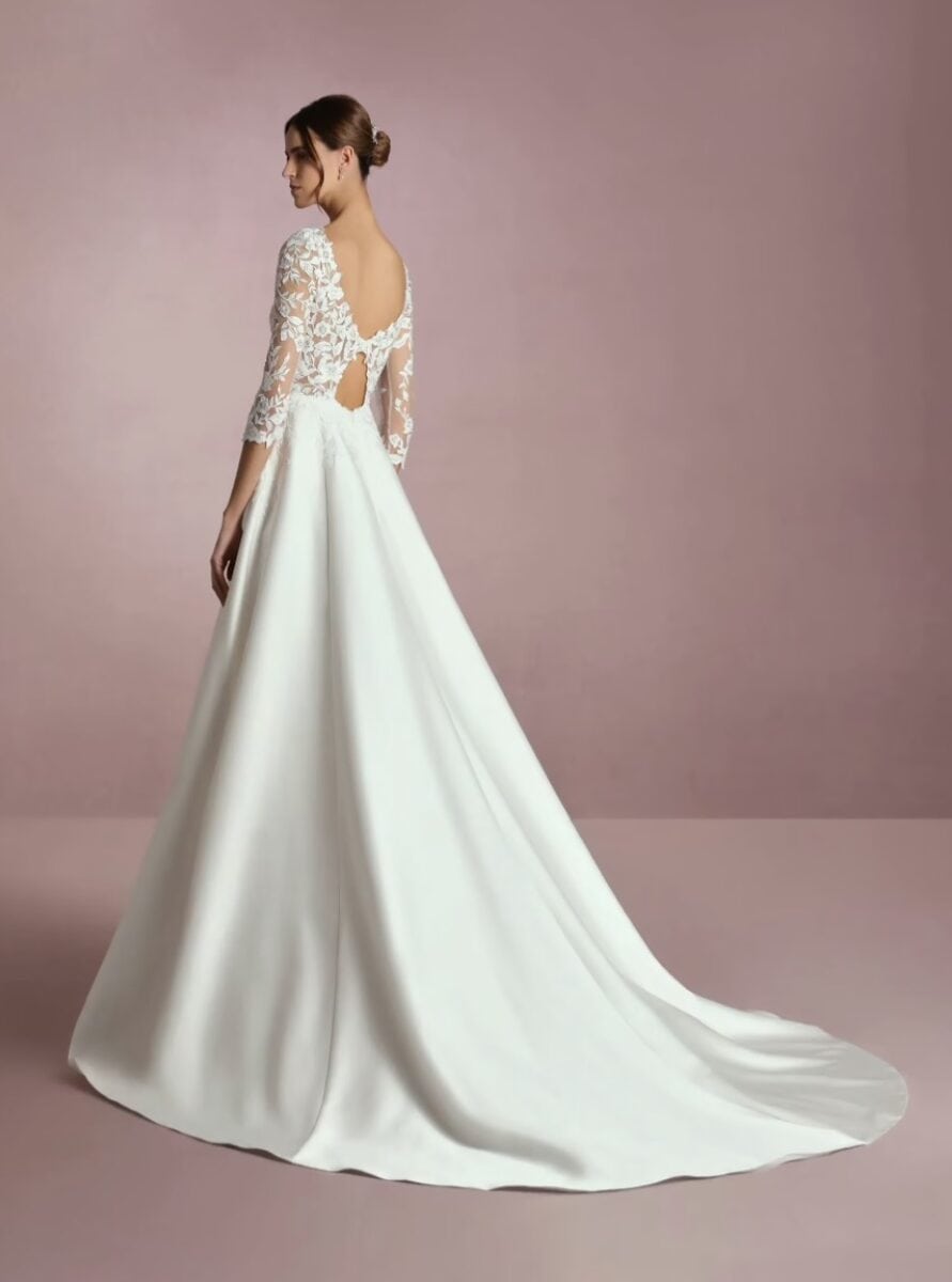Robe Monica avec sa jupe en mikado au buste structuré en dentelles transparente et manches 3/4, offre un maintien parfait et une silhouette sculptée. Sa jupe longue élégamment fendue apporte fluidité et allure, tandis que le dos en goutte apporte une touche différente.