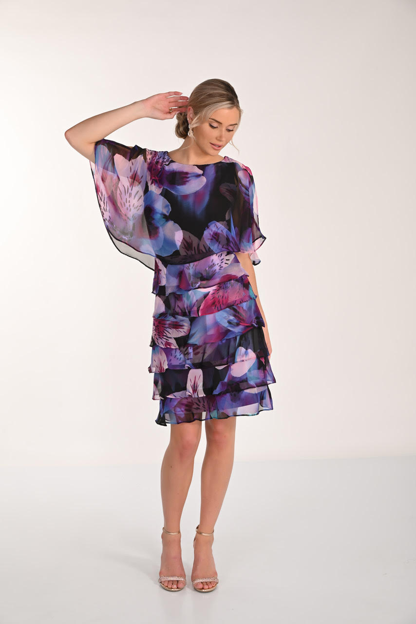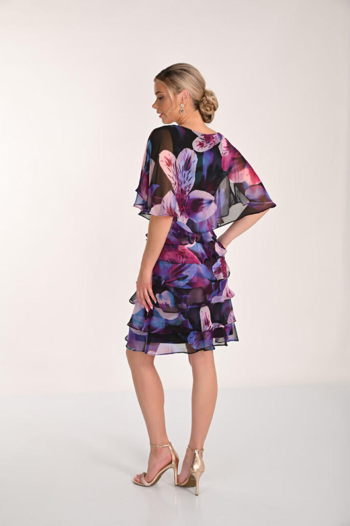 Sa jupe à volant apporte du volume et une touche féminine, tandis que le voile délicat sur les épaules sublime la silhouette en offrant une élégance raffinée et une couvrance subtile. Son imprimé élégant confère du caractère à la robe tout en restant chic et intemporel.