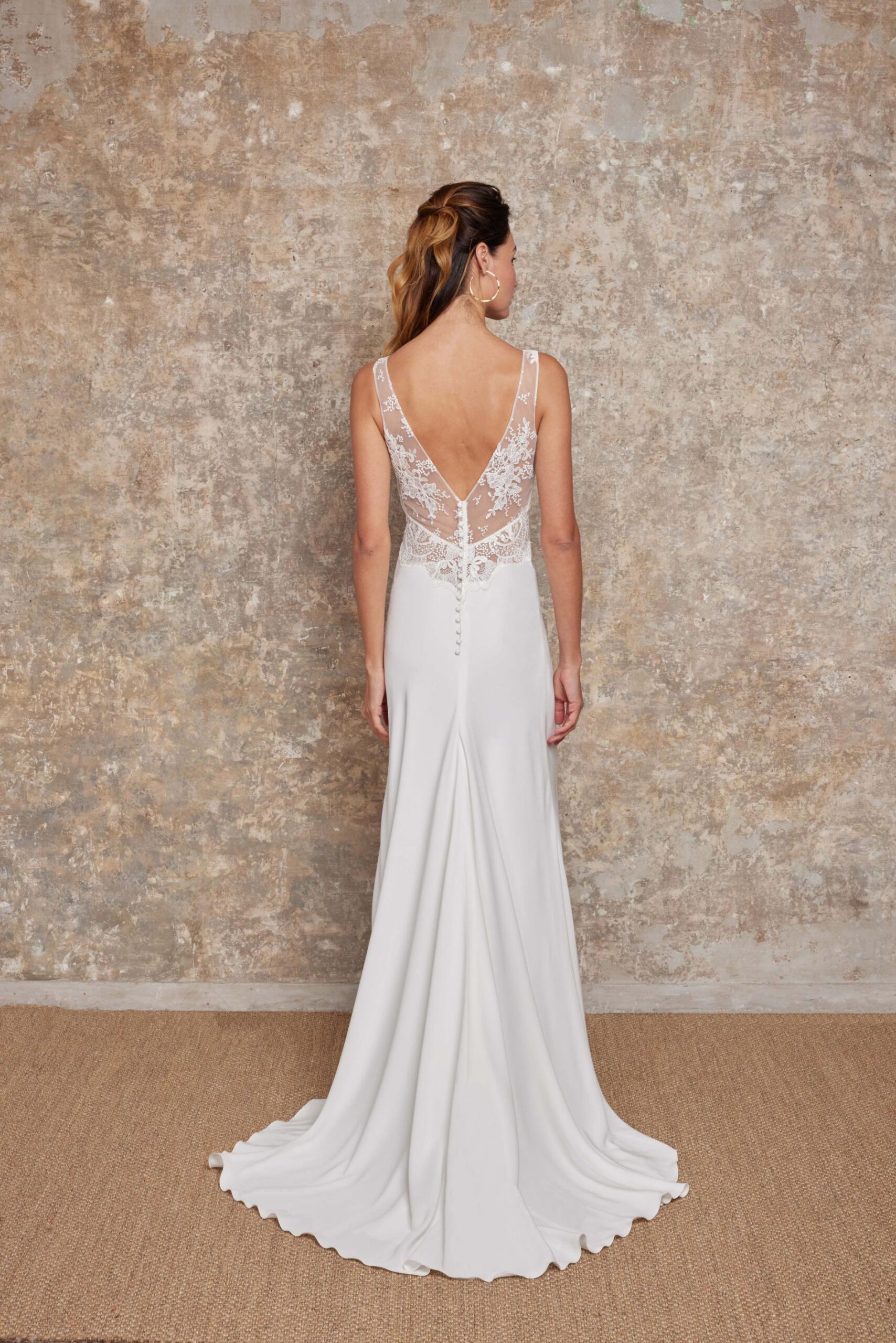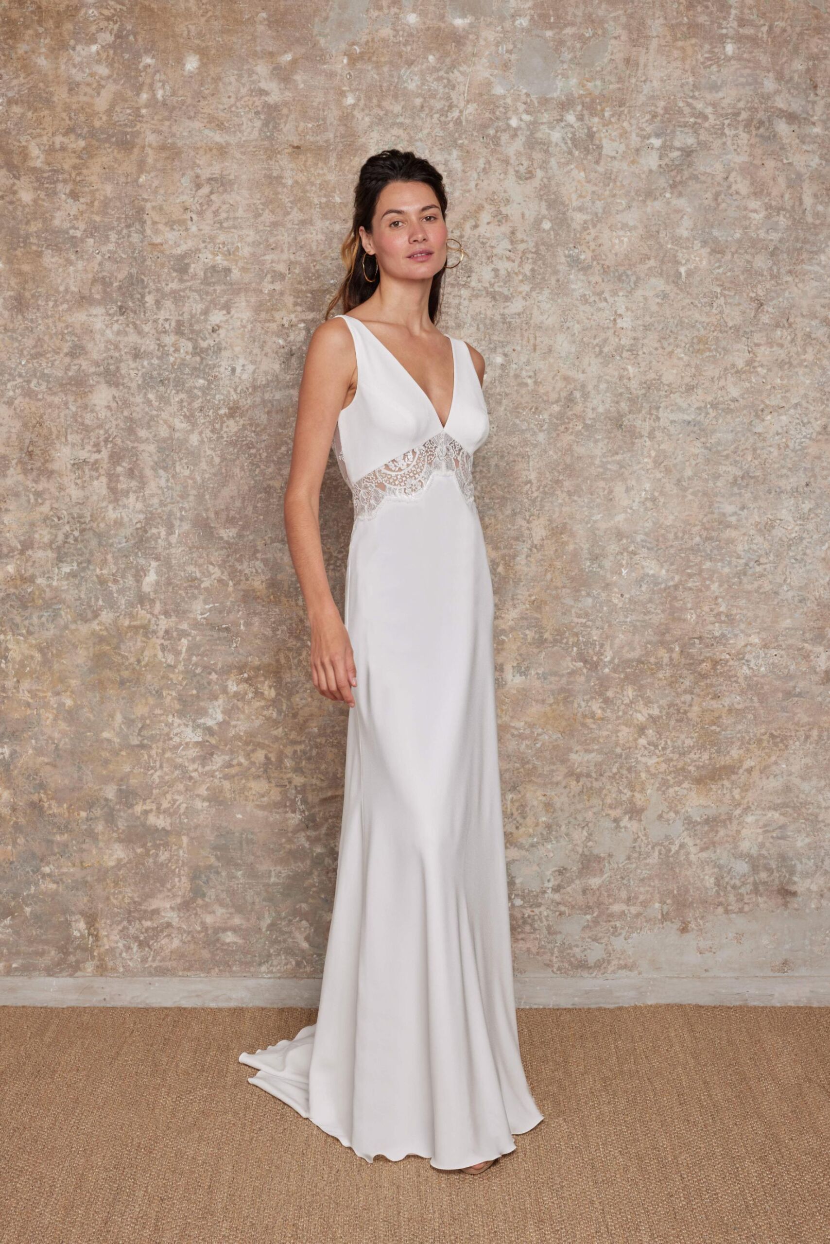 La robe Isaure de Lambert Création séduit par son élégance moderne et ses détails romantiques. Confectionnée en crêpe fluide et en dentelle de calais rebrodé, elle incarne un style raffiné et intemporel.