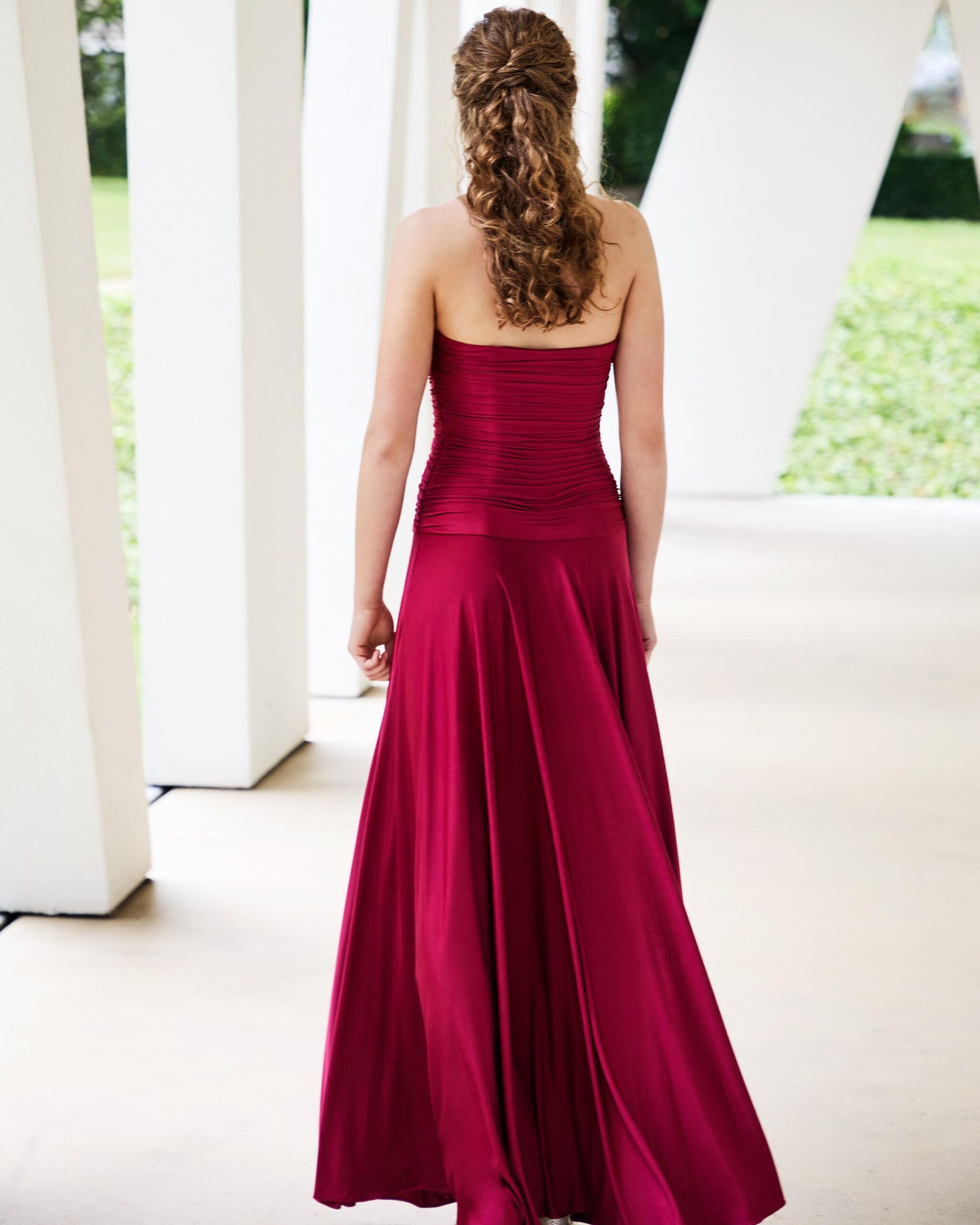 Son bustier drapé structure délicatement le buste et met en valeur le port de tête, créant une allure féminine et sophistiquée. Sans manches, cette robe souligne les épaules et le décolleté avec sobriété, parfaite pour une cérémonie chic, un mariage, une soirée habillée ou un événement formel.