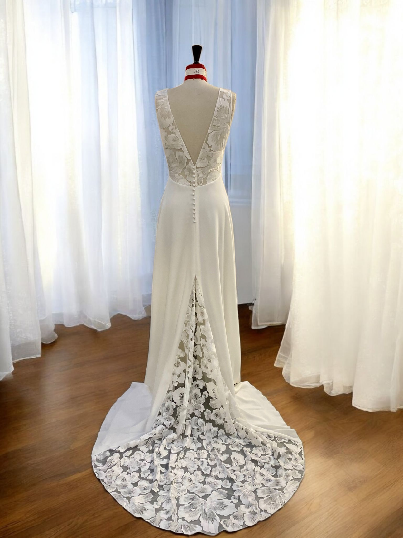 La robe Naomi de Lambert Création séduit par son élégance moderne et ses détails romantiques. Confectionnée en crêpe fluide et en tulle brodée de grosse fleurs, elle incarne un style raffiné et intemporel. Peut se porter avec des manches courte ou des manches 3/4.