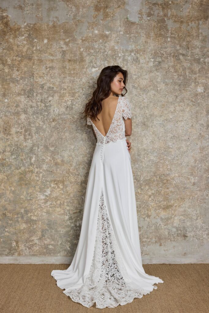 La robe Saturne de Lambert Création séduit par son élégance moderne et ses détails romantiques. Confectionnée en crêpe fluide et en dentelle de calais rebrodé, elle incarne un style raffiné et intemporel.