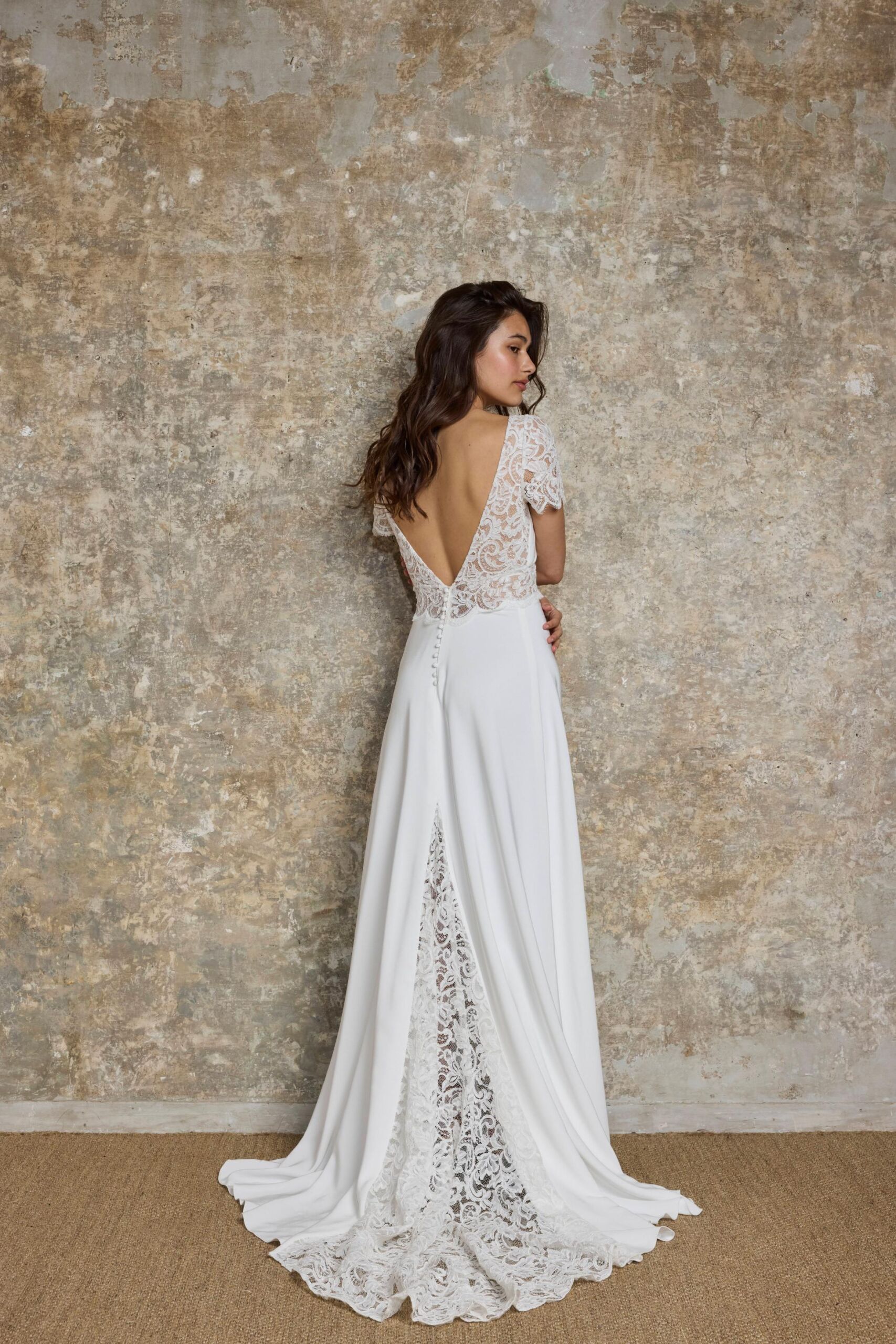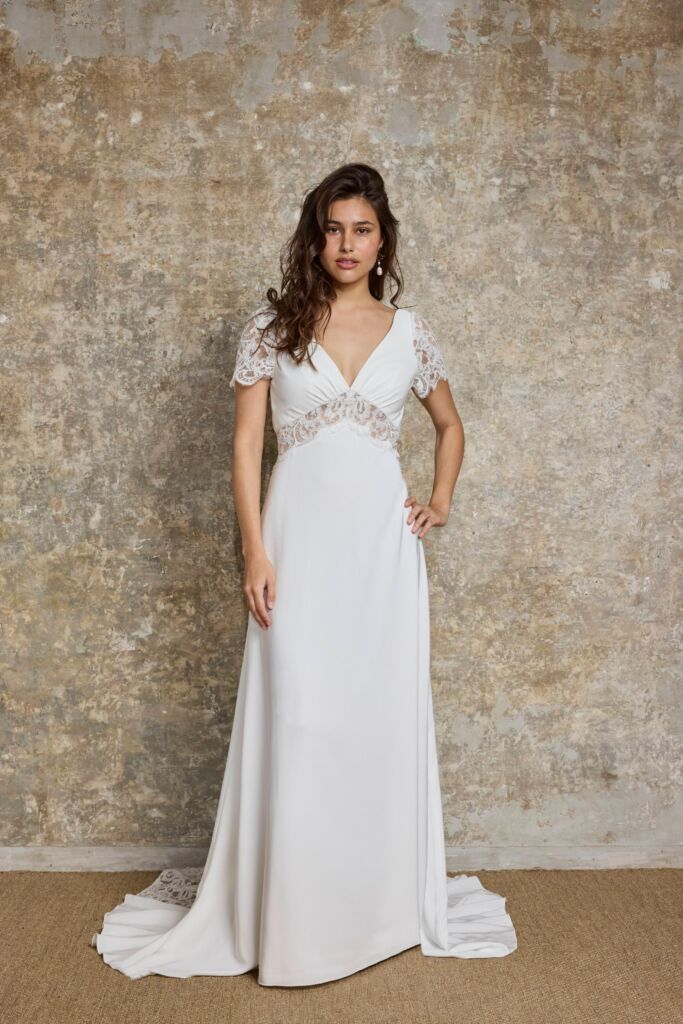 Son décolleté en V avec des petit plis sous poitrine devant, apporte une allure féminine et élancée, tandis que son dos en V donne un effet à la fois sensuel et sophistiqué. Sa quille en dentelle apporte une touche de sofistication, pour les mariée ne souhaitant pas obligatoirement porter un voile.