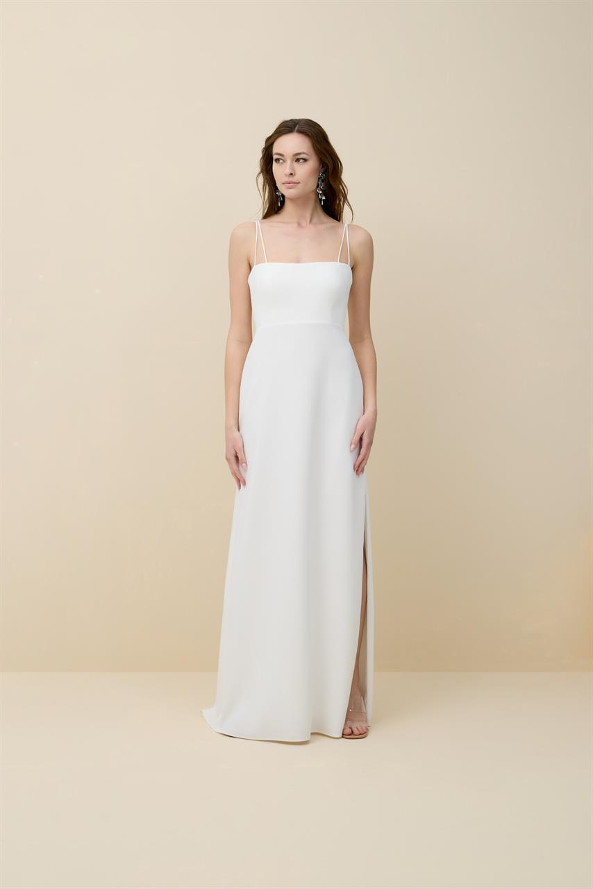 Sa jupe évasée, ajoute une touche de modernité à l’ensemble. Dos en forme papillon.