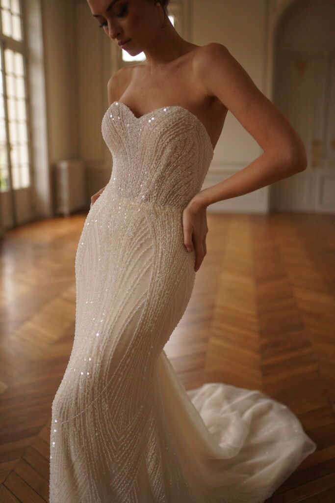 La robe de mariée Tiara est une création éclatante, idéale pour les mariées qui souhaitent briller le jour J. Entièrement recouverte de sequins scintillants, cette robe bustier au décolleté cœur met en valeur la féminité avec glamour et élégance.